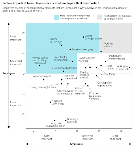 Employers and employees seem to hold different views about what is important. In the past 18 months, we have seen that employees are demanding investments in human capital: better pay, better benefits, and better perks. Employees really desire social and interpersonal connections with their colleagues and managers, as well as to feel valued by their organizations. In order to accomplish this, in-store personnel must be properly onboarded and motivated in the long term.